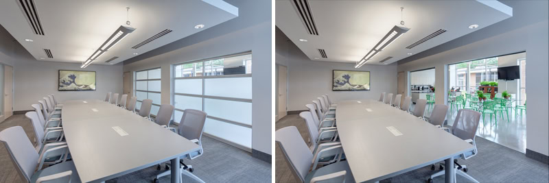 The conference room posed a little bit of a personal lighting challenge. Lifting the garage doors opens the space into the nifty break area.