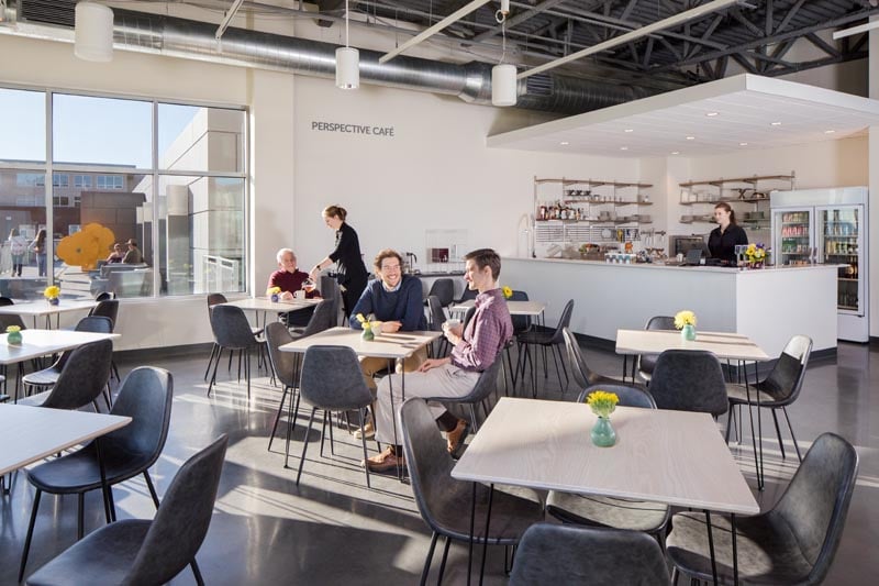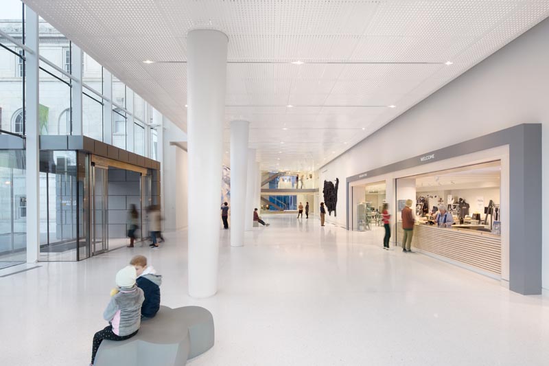 The museum cafe on the top level leads out to the mezzanine beyond.