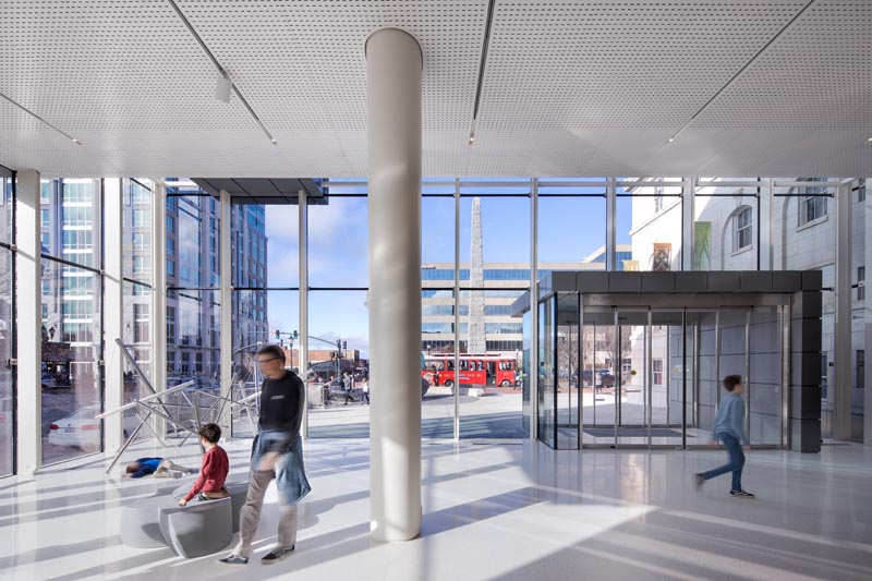 which I simply adore. This pocket extrudes beyond the front facade outside in a very visible manner from the street. Viewers in Pack Plaza can see the visitors considering the installed art inside. This inside-outside interaction is a distinguishing marker of modern architecture, no matter the era it was built.