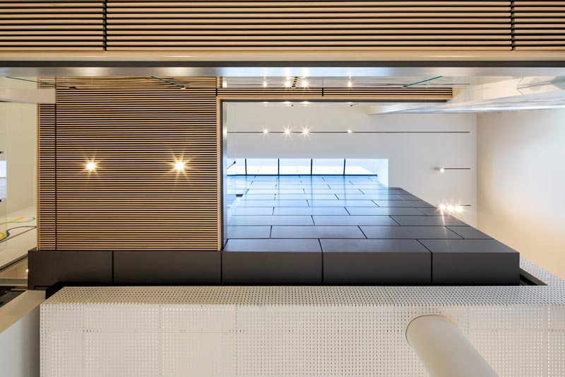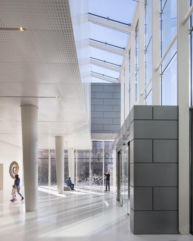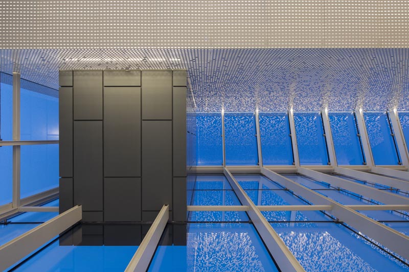 From the third level, you can see the termination of the cradle as described above. Resting directly on top is a rectangular metal-panel clad form that likewise extrudes to street view. The atrium above washes the metal paneling inside with natural daylight.![]()