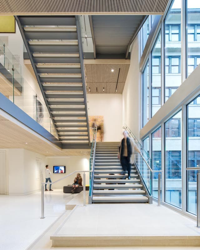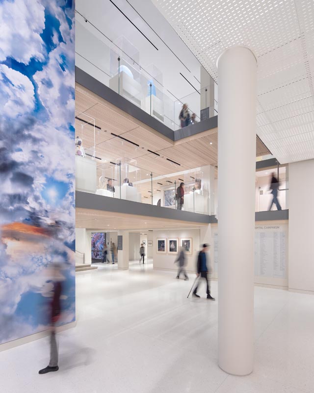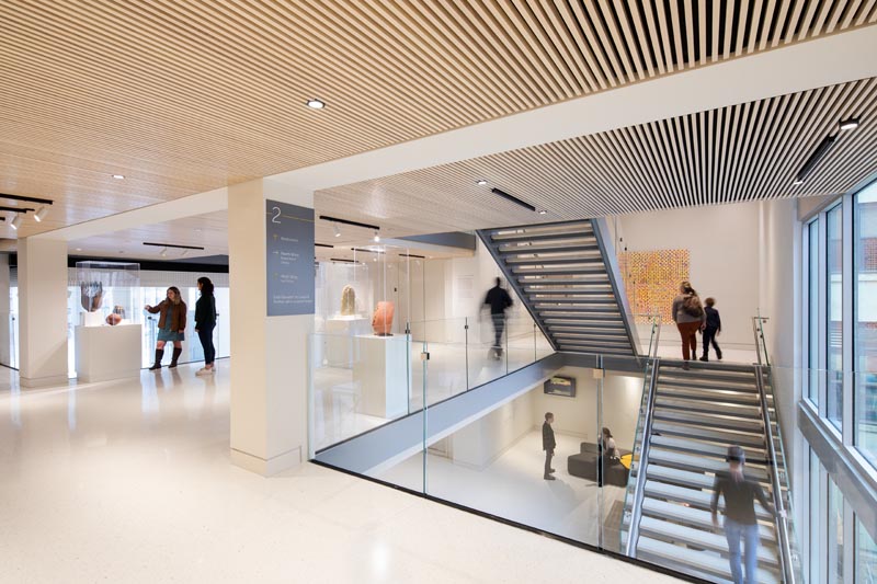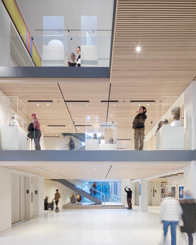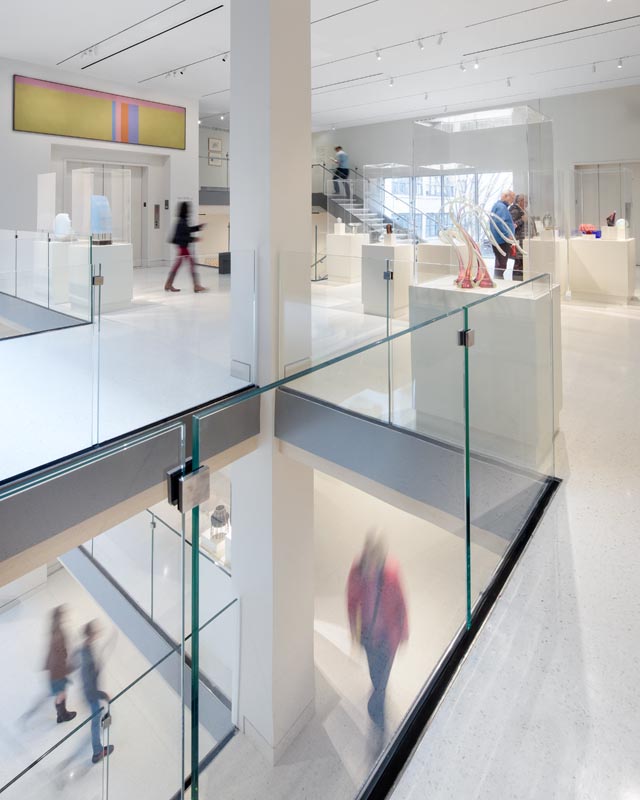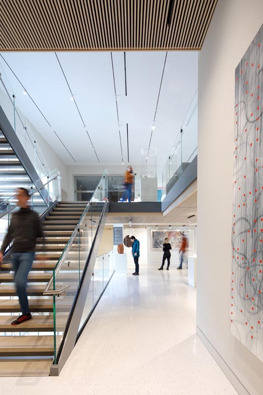 Once visitors emerge from underneath the cradle, they can go up two levels of stairs to view more art on the landings and enter galleries beyond.