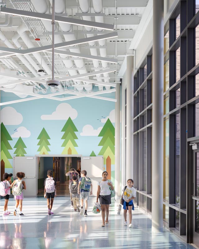 I liked the lighting solution here in combination with natural daylight, so in combination with the graphics, decided to mimic the vertical nature of columns with cartoon trees in the background as students walked to their classrooms to start their day.