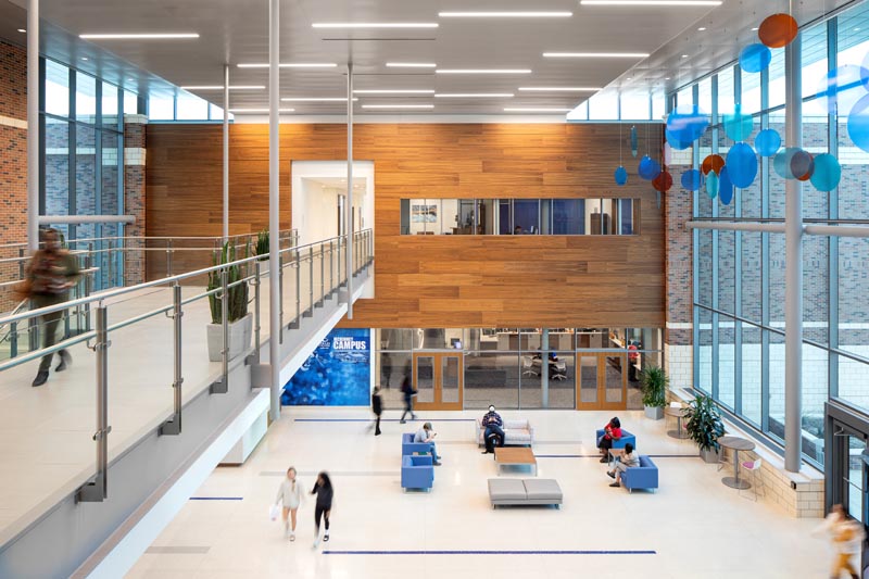 Outside, the rear of the welcome center faces the college’s campus student quad.