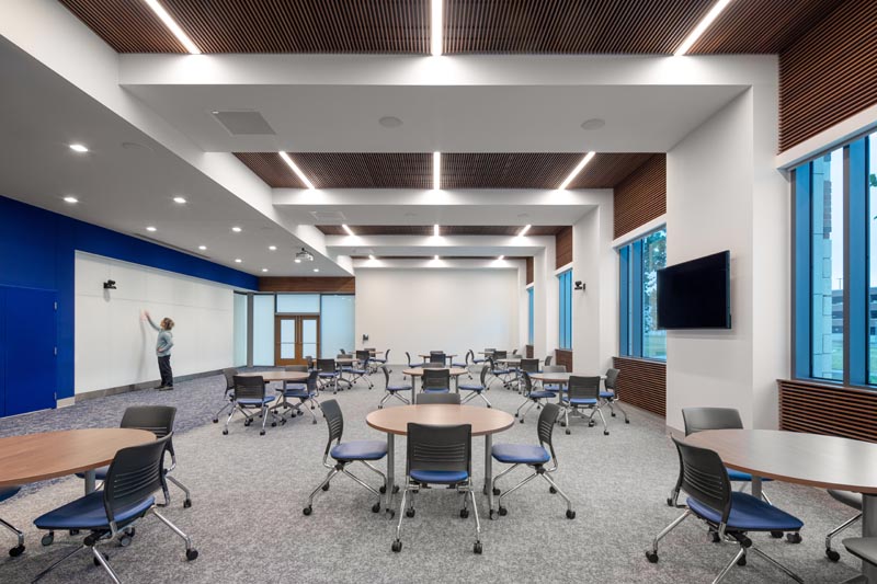 The multipurpose room continues repetition inside with bays of wood paneling and L shaped wall and ceiling furring.