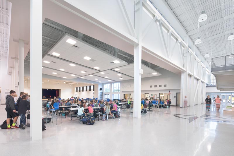 Sloped acoustical panels above the cafeteria keep the space below feeling open while shield mechanical systems and ductwork from view below.