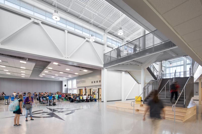 This is what the cafeteria looks like with moving partitions shuttered. A grand staircase serves as one of the two centerpieces in the commons. The acoustics here are pretty darn good, the sounds of the children in the cafeteria and in the halls do not emanate throughout the building.