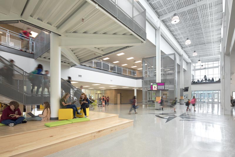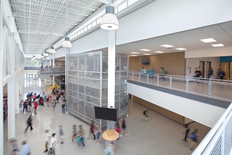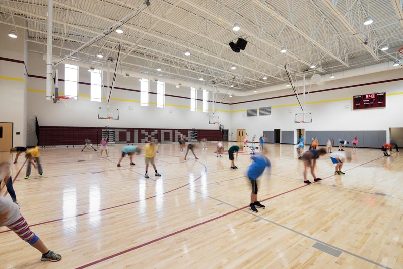 Upon entering the school, you’re immediately greeted with an expansive daylit commons area that serves as the building’s main artery. One side opens into the cafeteria – further beyond, able to be closed off by moving partitions, is a room that double as a performance room/auditorium and small gymnasium.