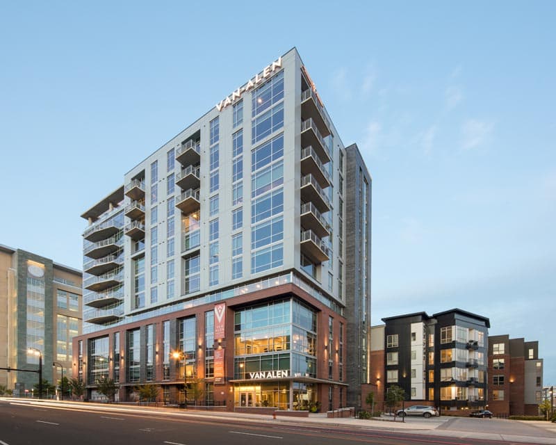 Immediately adjacent to 555 Mangum are the Van Alen Luxury Apartments, designed by Cline Design. The footprint of these apartments is enormous, with 4-stories worth of apartments filling most of the space, and a mid-rise tower emerging adjacent to building 555.