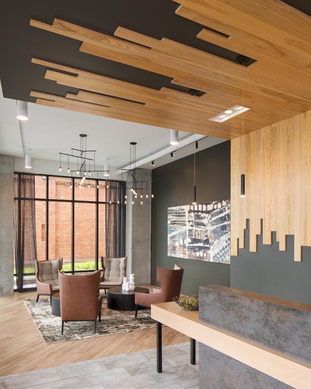 Public building spaces and amenities filter out to a covered entry and balcony facing the street.