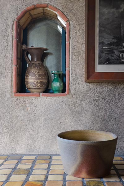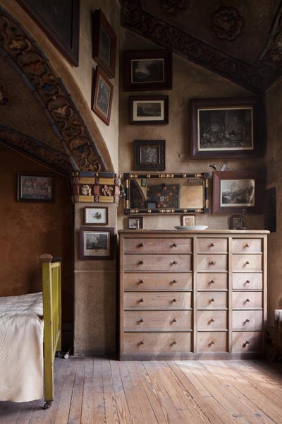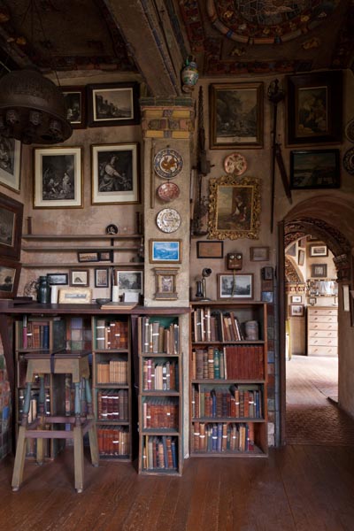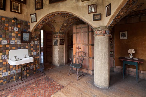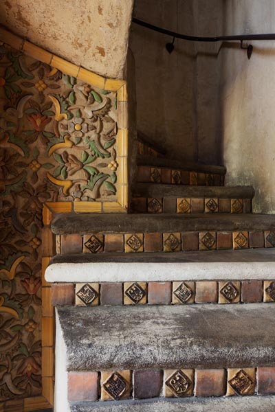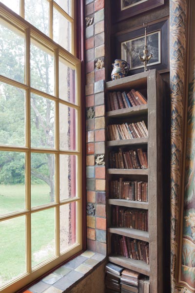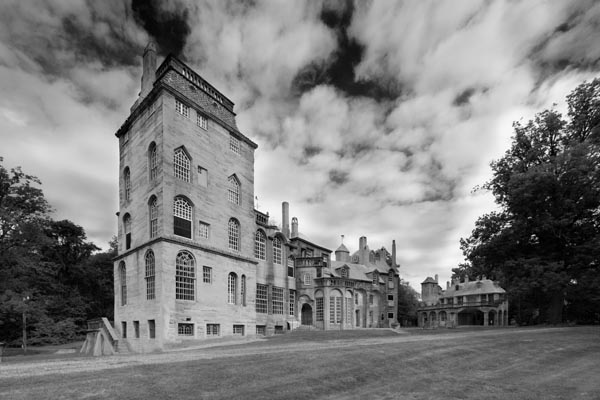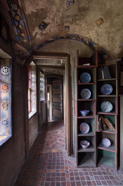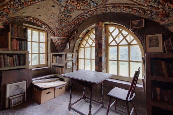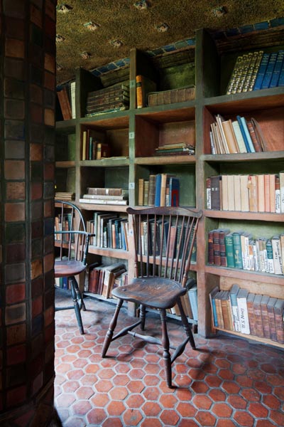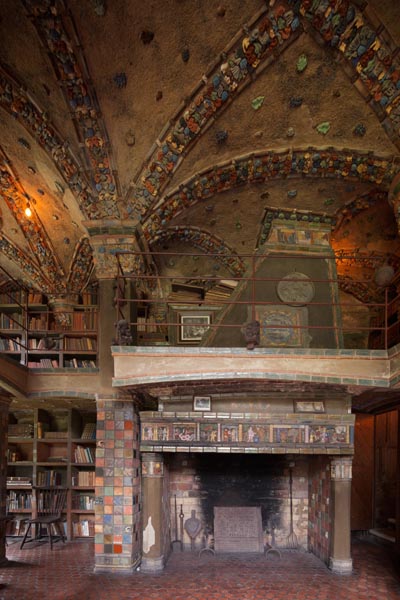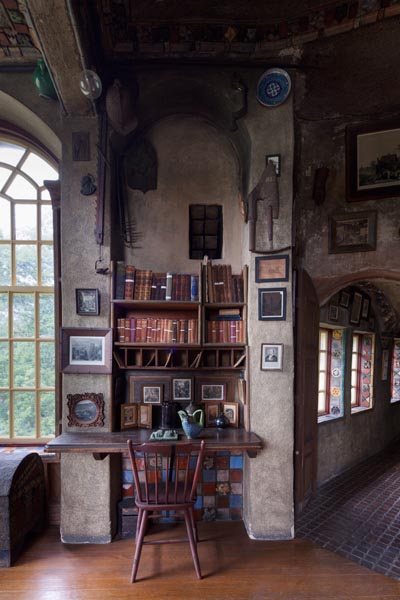 Fonthill was built in the early 20th century by Henry Chapman Mercer an archaeologist and anthropolgist. Mercer had no training in architecture but designed and built the entire house himself between 1908 and 1912. An early example of pour-reinforced concrete structures, the house is an odd assortment of Medieval, Gothic, Byzantine architectural styles layered with decorative Moravian tiles and artistic prints.