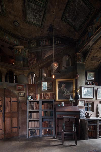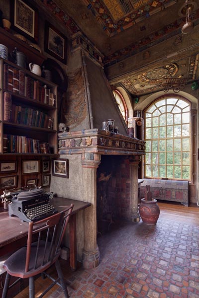 The second-floor study was my favorite spot in the whole house. Look to the left where you’ve got a fireplace, skull sitting on the mantel, and Remington typewriter,