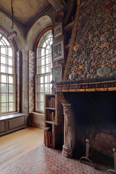 The concrete castle features 44 room sand 18 fireplaces with over 200 windows! I dig the ceramic work wrapping the chase above the fireplace mantel here.