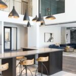 The break area takes on mid-century modern inspiration, from the wood-paneled cabinetry and island with perfectly rounded corners to within the immediately adjacent diner-style booths.