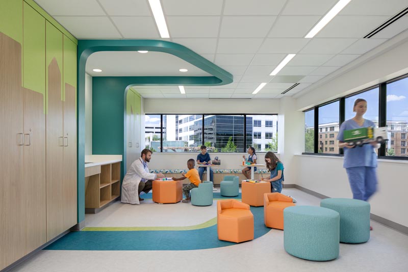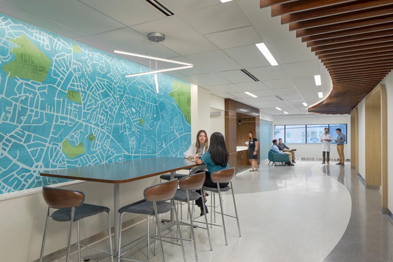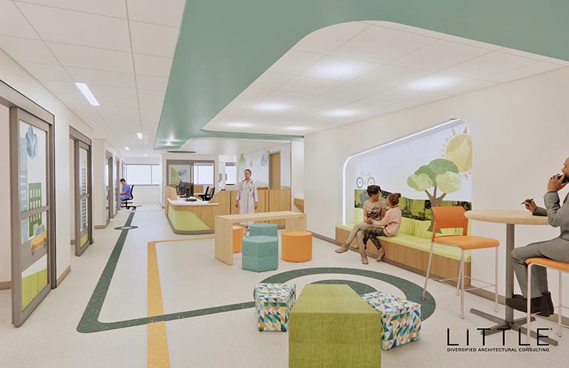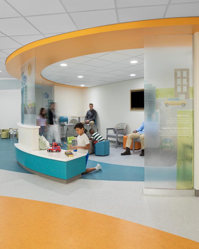 This is one of the nurse stations, again tied with built-in visuals, lighting, wall and directional floor graphics.