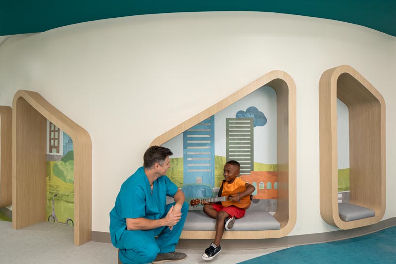 There were many recessed cubbies at a scale for children to stand, sit, and interact.