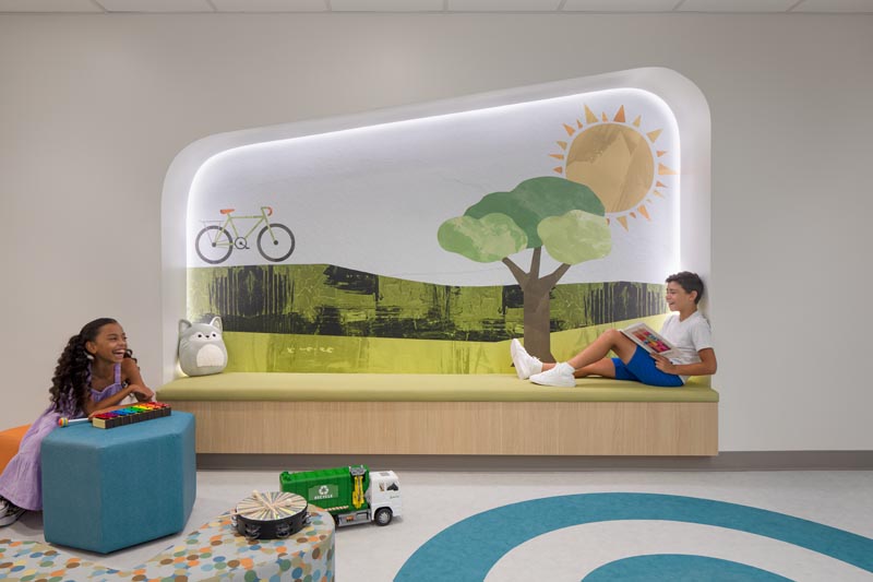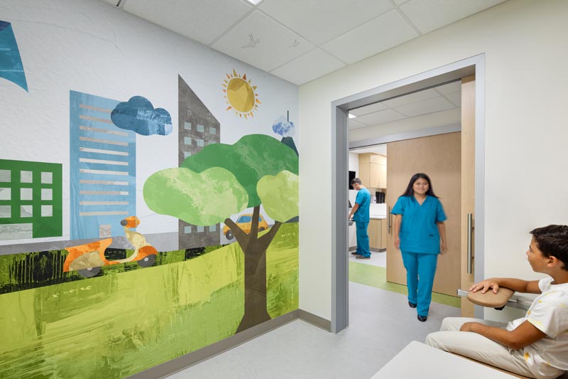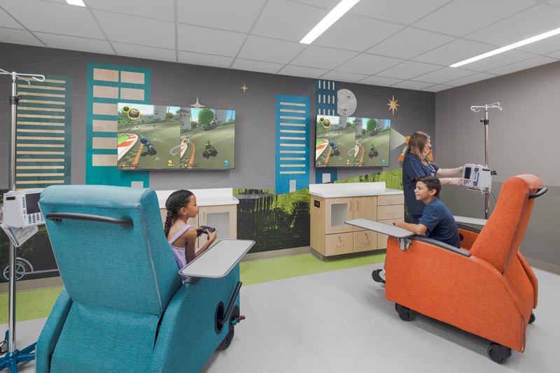 The infusion room has playful wall city graphics with two televisions and game controls.