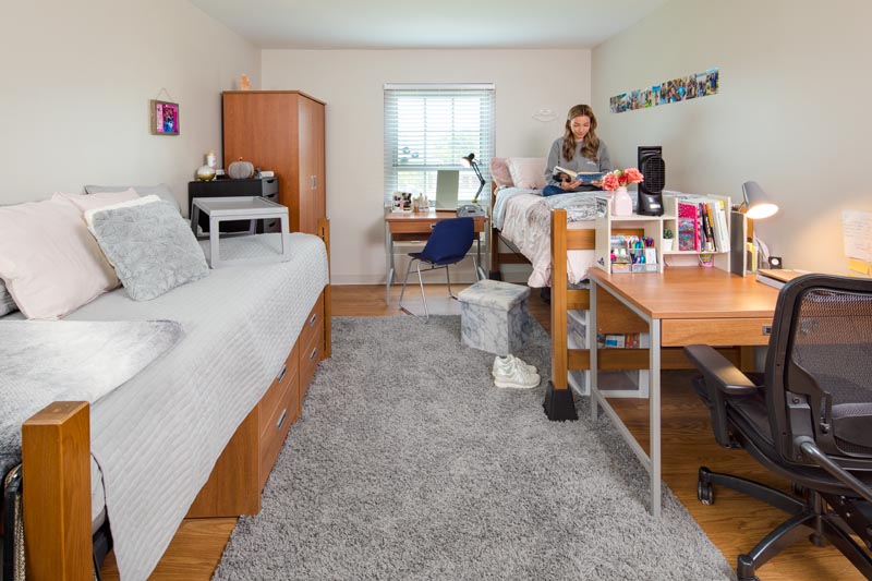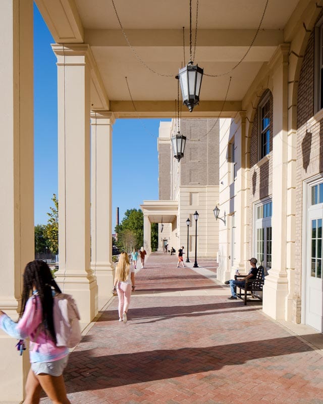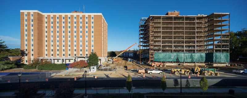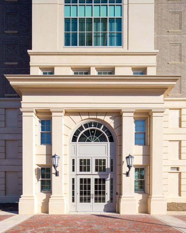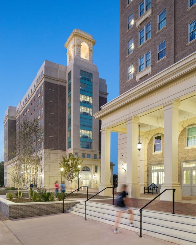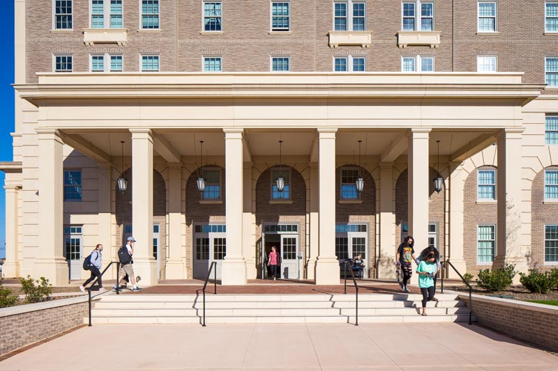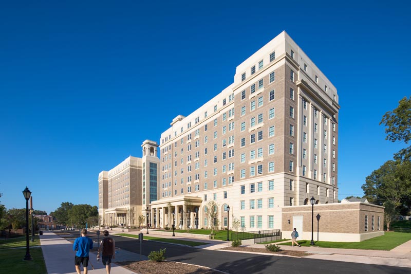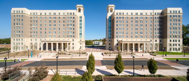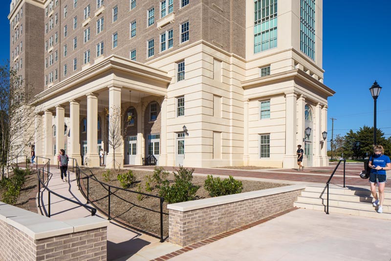 And two years later in 2020. New construction not only included the two residence halls but redesign of the exterior plaza space, taking some neoclassicist cues from the rest of campus.