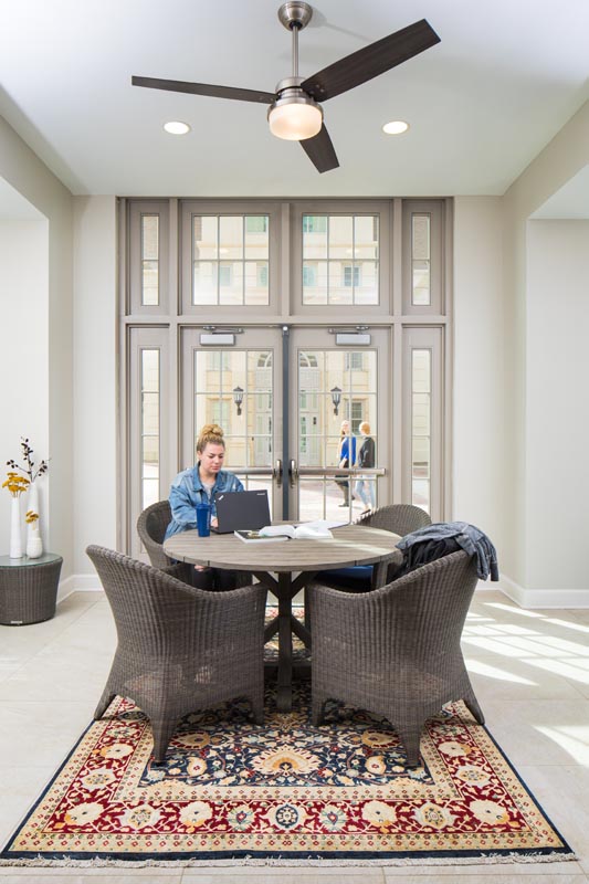 Students traverse to and from other campus destinations from the plaza level.![]()