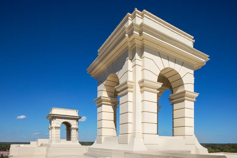 Between the dormitories are the towers which terminate on plaza level with an arched transom above a pair of doors with glass panels.