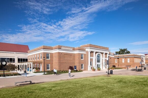 The Student Success Center is directly between the university library, a modern building with pitched metal roof and police building that has ionic-style columns and entabulature.