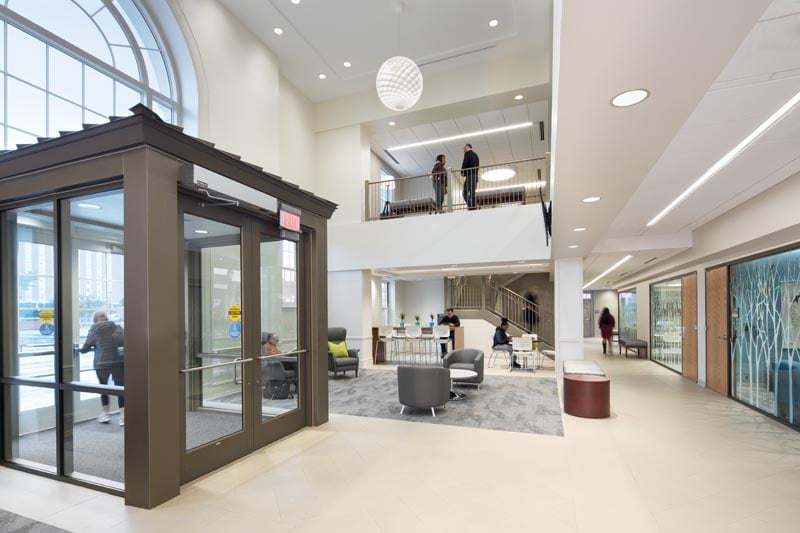 Students enter the center through a covered vestibule that sits directly in a 2-story entry space.