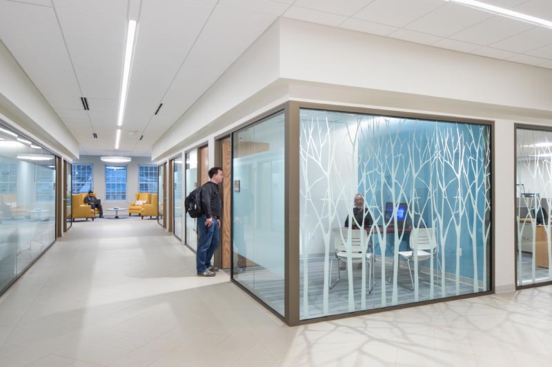 Interior graphics on the windows cast natural tree shadows on the floors along the corridors, providing informal division of space by opening the program to the public yet providing privacy inside each individual room.