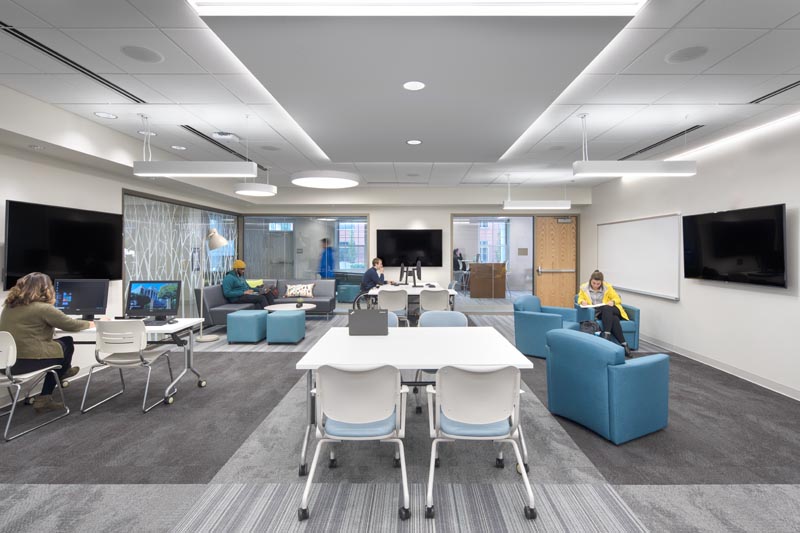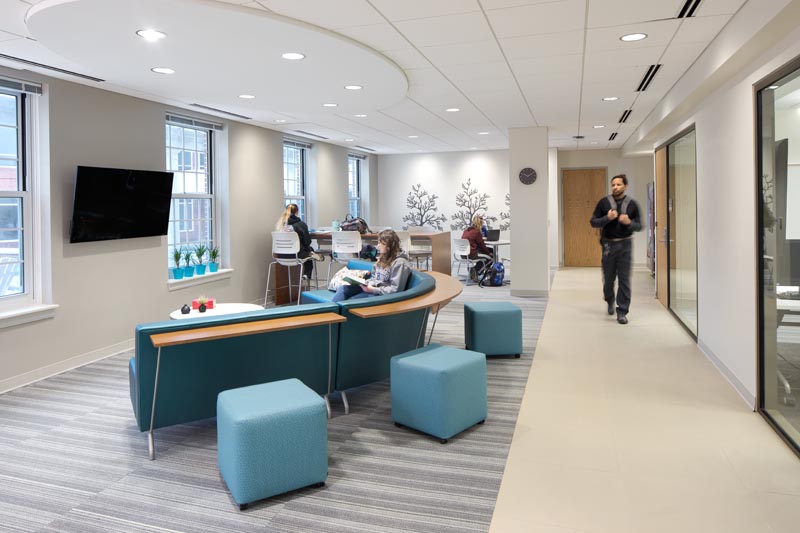 Corridor spaces open into some larger sitting and study areas for students.