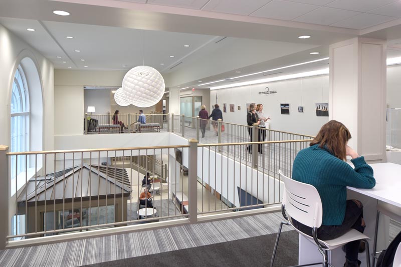 The two-story lobby space from the second-floor featuring sitting areas, study spaces, and an art gallery along the corridor.