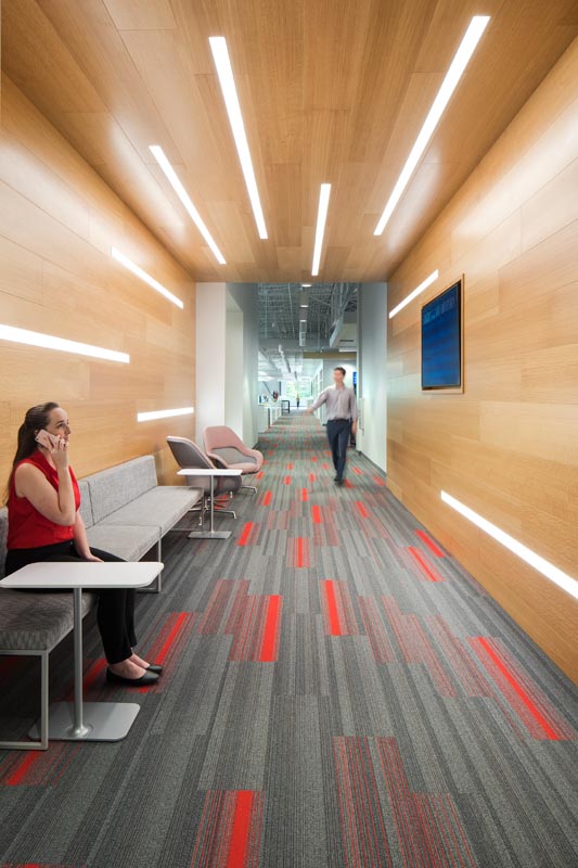 It was a pleasure again to work with Integrated Design on several projects including Bob Barker’s office space in Fuquay-Varina, North Carolina. The corridor transitions between the entrance lobby/public spaces and employee areas.