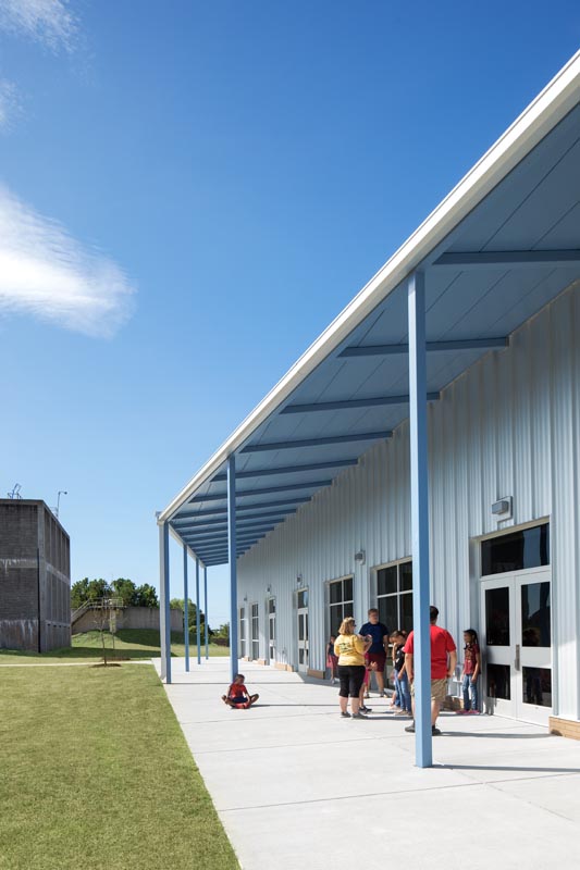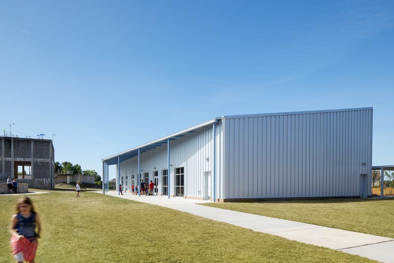 Closer to the coast near Jacksonville, North Carolina, Sawyer Sherwood performed the design and architecture for Sturgeon City Environemtal Education Center featuring two basic masses, the metal-clad portion for classrooms and events. The sloped roof continues overhang, with it’s shape casting morning shadows on the building.