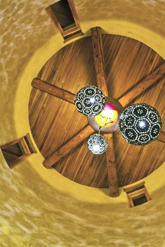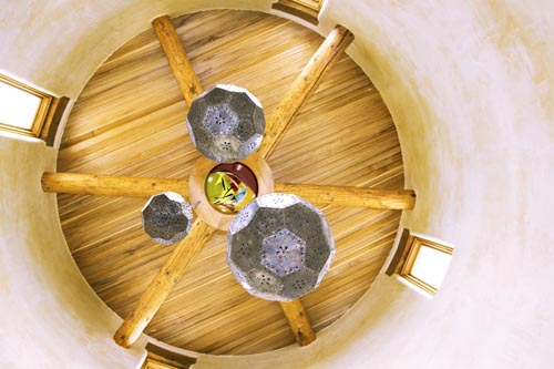 Looking directly up through the center of the house, you’ll see a sculpture installed above. A night in transforms into a kaleidoscope.