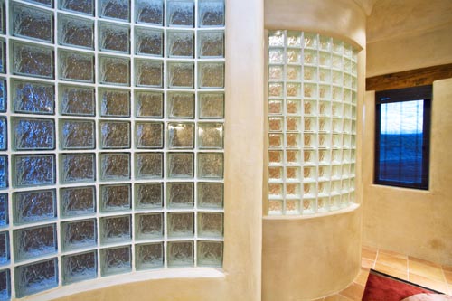 Below is the master bedroom and bath, located on the second floor. Glass block was installed in keeping with the organic architecture in the bathroom.