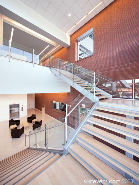 This view from the stair landing is a composite stitch of three images with a 17mm tilt-shift. The furniture, which you’ll notice is in the same configuration as the lobby photograph above, is in a different location to make the photo read better – probably about 4 feet to the right and a little closer-than-comfort to the elevator. I didn’t mind the reflections here, I thought it helped distract from the change in brick color.