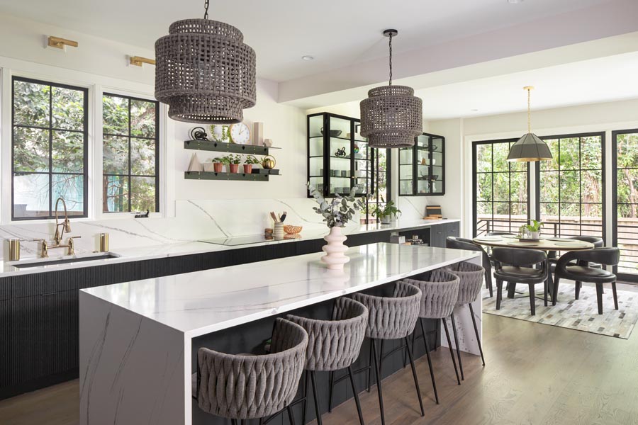 I love how Jessica tied modern language to the existing home, inside and out. This function and form of the pantry wall marks transition between family room and kitchen, that turns a corner towards the dining area.