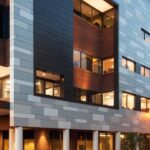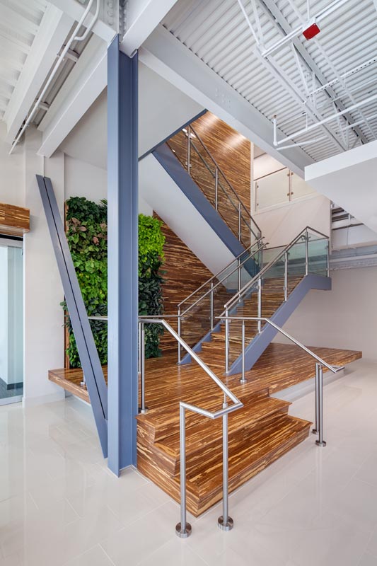 The centerpiece of the new lobby is a wood stair with small green wall.