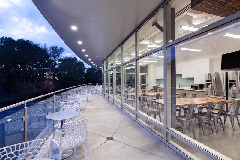 The break room space visually continues beyond to the balcony beyond, forming the curved mass seen from the outside.