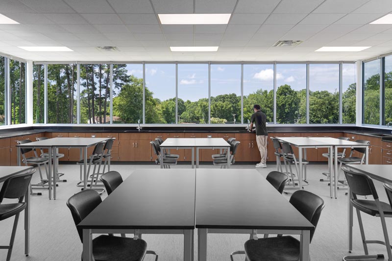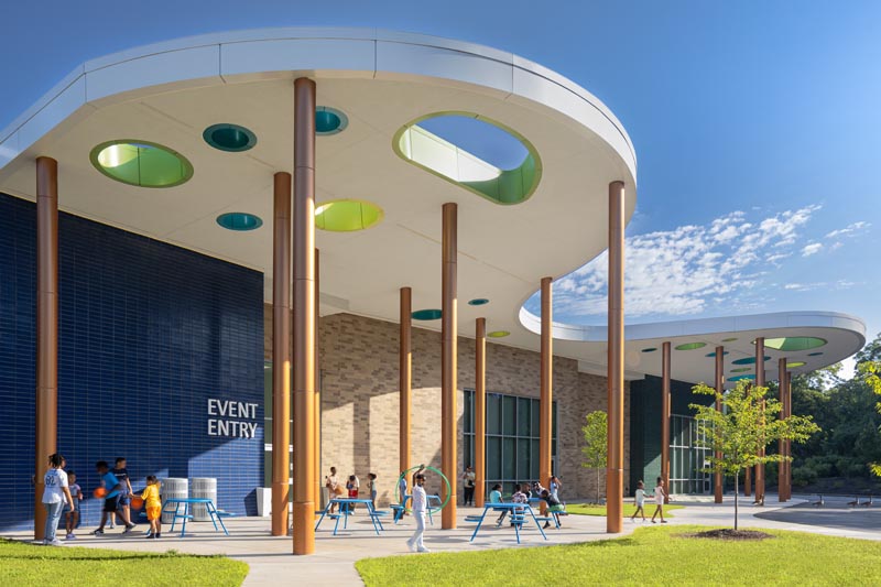 Layering in one-point perspective is one of my favorite things to do as an architectural photographer.  Here, SHP designed a space for other classes or children to side up to the opening and participate in the class inside.  Beyond are the architectural columns in front of the greenery of the woods beyond.