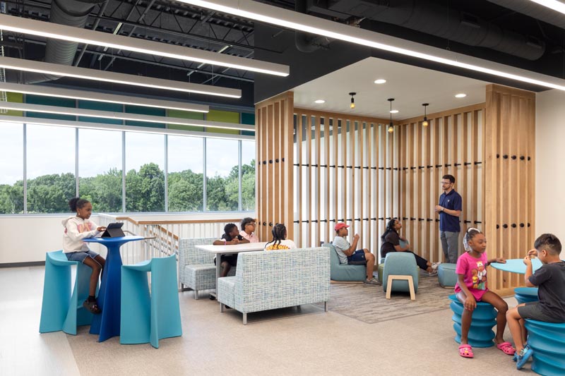 Maker spaces were designed in a manner to be partitioned by garage door) or kept open as an entire room that extends to viewing into the corridors.