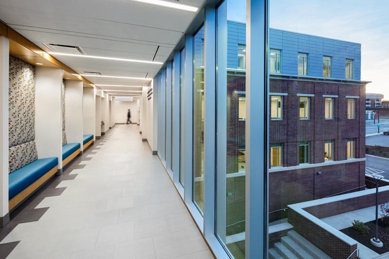 The fenestration hallways with seating areas, link to classrooms have practical and visual connection with other parts of the building, exterior courtyard and town beyond.