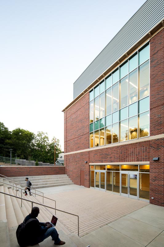 The Health Sciences Building sings at night. Pfeiffer University’s seal and history are reflected in the graphics of the glass-encased exit staircase. You can see the metal wrapper cascade down from the roof to cradle this prominent visual element.