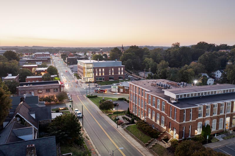 Last is an aerial view, displaying how the building sits within the surrounding downtown area, drone photography supplied by Myles Gerbach of Myles Per Hour Photography, You can see how visual elements and materials of the building draw inspiration from Albemarle, especially the adjacent mill building, renovated for modern use.