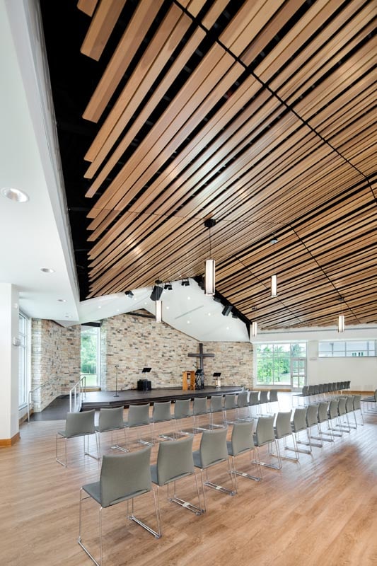 The new chapel’s roof is pretty nifty, it’s bird-like wings soaring over the congregation. It flies reverse of how one might ordinarily expect, with wood panels sloping downward towards the pulpit at the front and upwards towards sunlit windows in the rear.