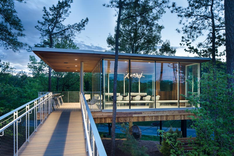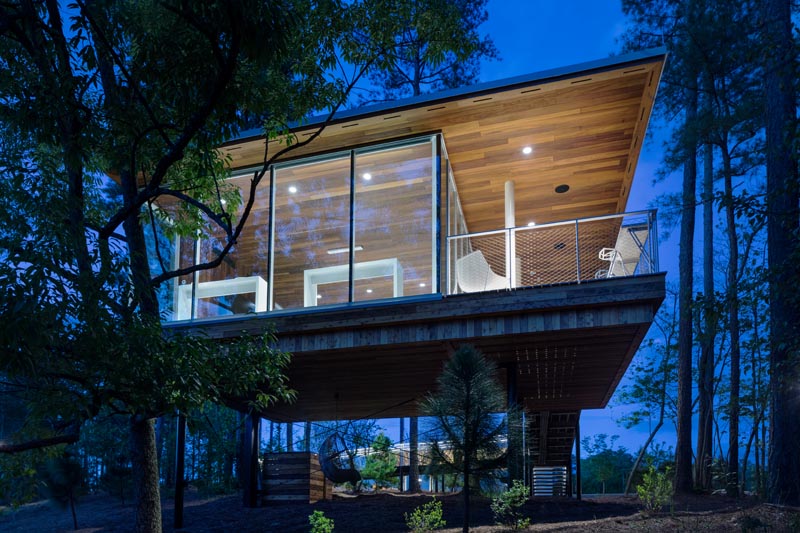 The treehouse is a pretty modern design, encased with glass on all sides. Built on a steep incline, you can spy a swinging chair sheltered underneath.
