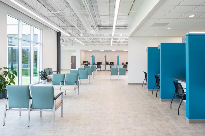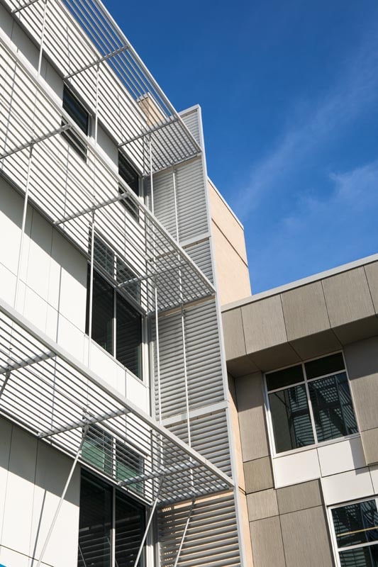I’ve only recently started working with Sawyer Sherwood, but one thing I’ve noticed on the buildings I’ve photographed for them so far, is a tendency to combine one or two significant gestures on the exterior, effecting light and cast shadow on the building facade. In this design, that came into play with the sloped blue canopy above the main entrance and shading devices above.