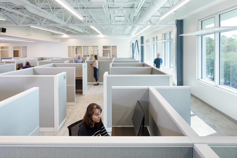 For a building of this size, there really aren’t that many dividing walls, except of course to separate and secure public from private areas. The building structure and mechanical systems are exposed and painted white above, which increases the impact of the natural light in the open spaces below. Structural columns supporting the floor plates are recessed from the building envelope and are highly visible inside and through windows from the outside.