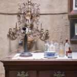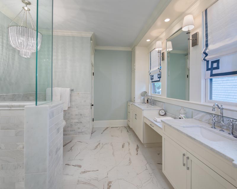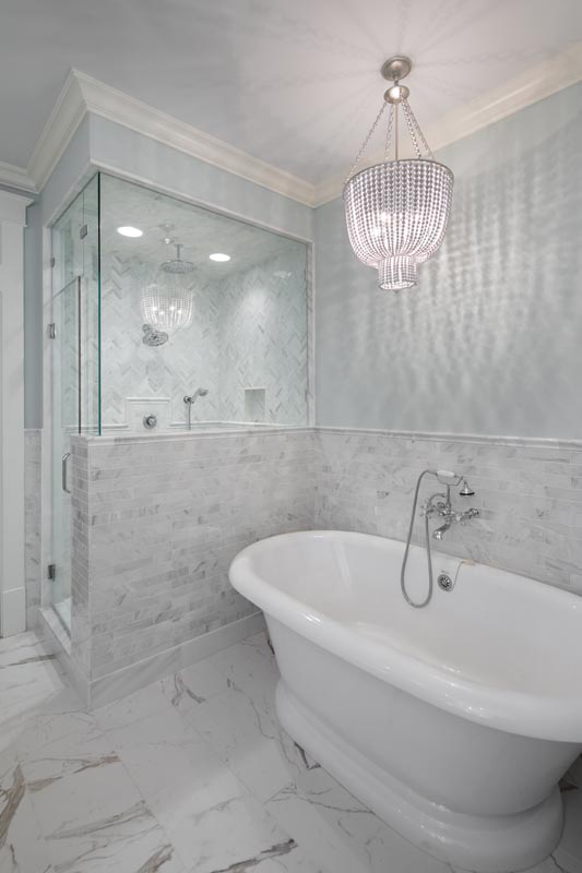 The master suite’s bathroom features a pretty boss chandelier that marks the space’s centerpiece over the freestanding tub.