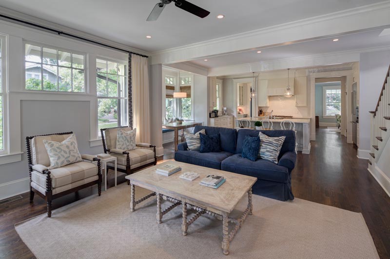 The living room and kitchen forms one space, transitioned by a column and beam assembly.