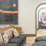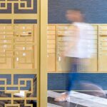 Inside is the main apartment lobby and sales office. The development has an industrial and railroad theme, drawing inspiration to the rail lines that once navigated the area. In the lobby is an old-school passenger information system with rotating letters.