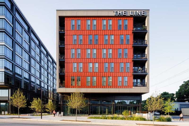 The Line development and Smoky Hollow landscape architecture was designed by JDavis Architects and built by Clancy & Theys Construction. Let’s get started with showing the neighborhood overhead by Myles Gerbach of Myles Per Hour Photography, wonder with the drone.