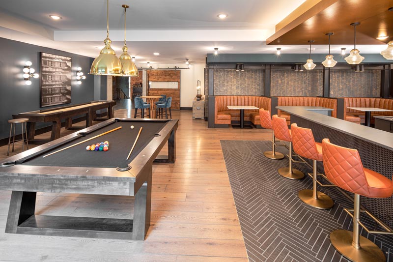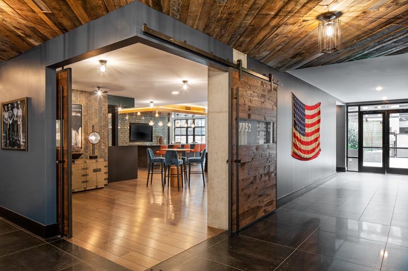 Rolling wood timber doors reveal a bar and lounge for residents on the second floor. That’s a 48-star American flag in the hallway leading out towards the pool deck.